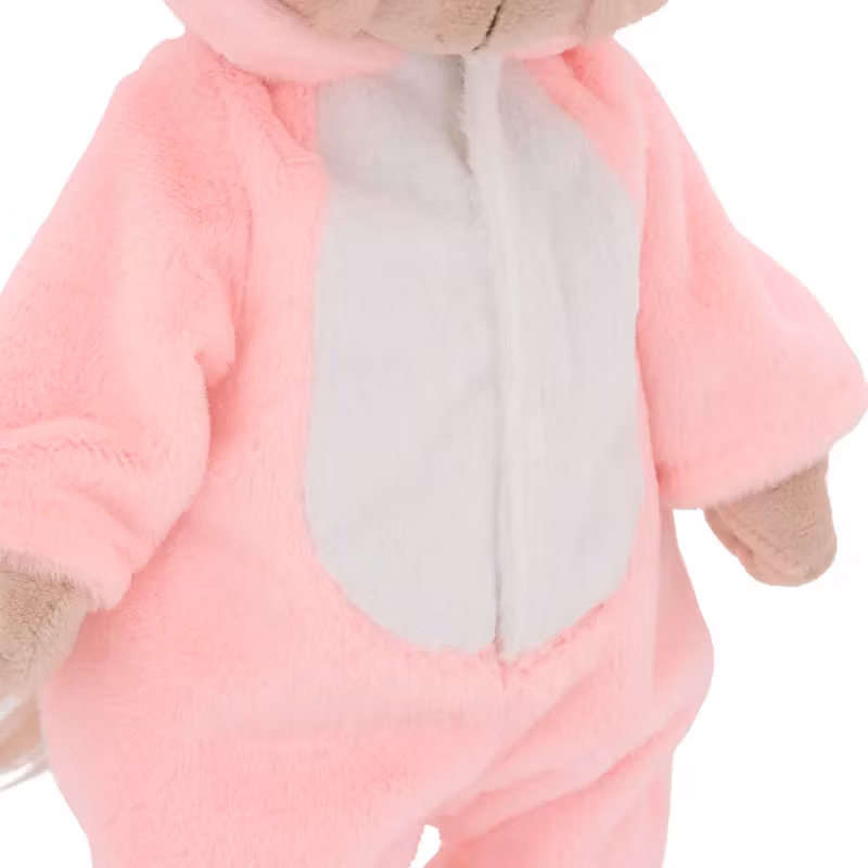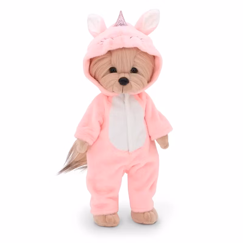 Klädd i en mjuk och gosig rosa jumpsuit prydd med bedårande detaljer på huvan - ett glittrande enhörningshorn, små öron och ett broderi i form av blundande ögon med ögonfransar.