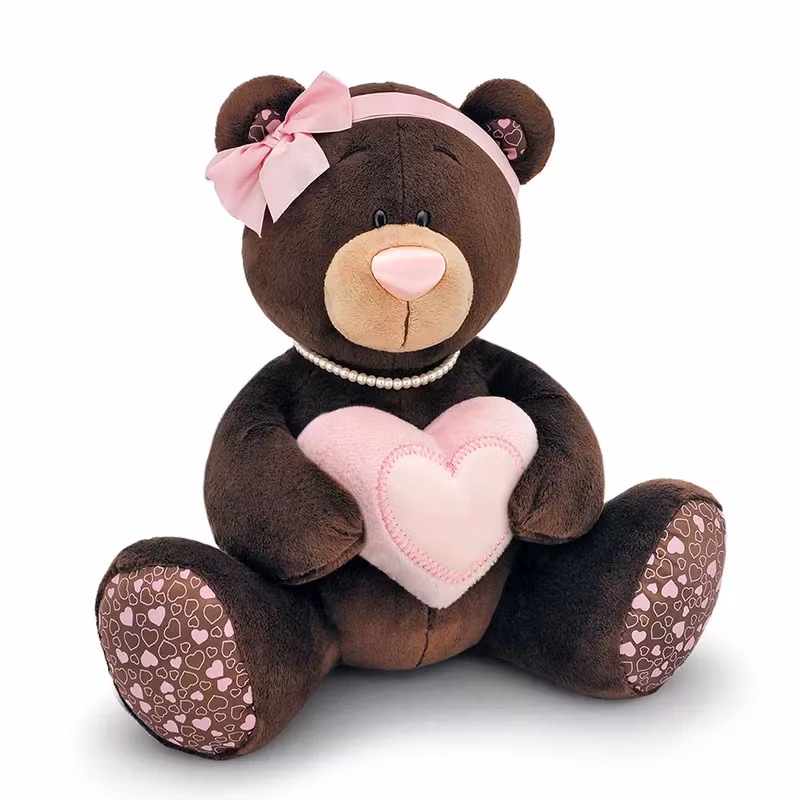 En lyxig och bedårande nallebjörn i en rik nyans av mörkt chokladbrunt som sitter och kramar ett gosigt rosa hjärta.