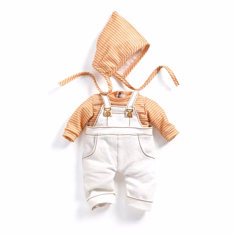 Ett snyggt och trendigt set med kläder till dockan, med rymliga hängselbyxor, en långärmad rutig tröja och en matchande hätta som kan skydda dockan mot sol eller blåst och blir lite pricken över i för denna outfit.