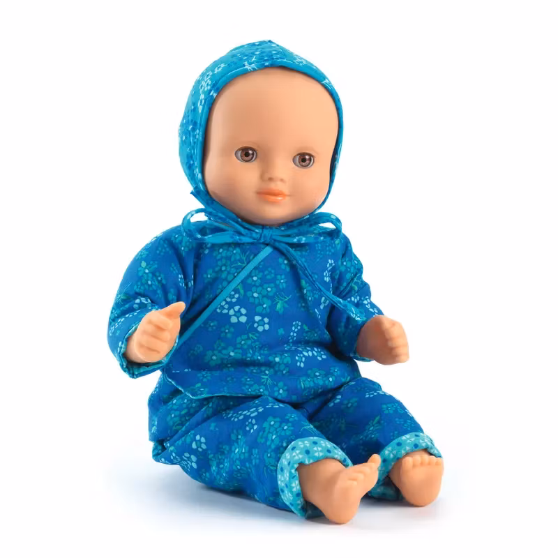 Ett snyggt set med kläder till dockan som passar perfekt för våren, i 100% bomulls muslin med ett vackert blommigt mönster i blåa toner, med inspiration från Japan.