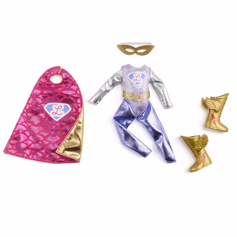 Ett set med utklädnings-kläder till din Lottie-docka -se henne bli en äkta superhjälte!