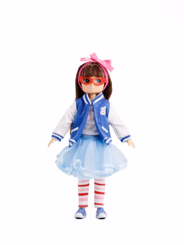 Det är kul att upptäcka ny musik, släppa loss och bara vara sig själv oavsett vad andra tycker. Dockan är 18 cm hög, har mörkbrunt hår, blå-grå ögon och kommer med: 1 blå-vit college-jacka i vintage stil, 1 sött hårband med rosa rosett, 1 långärmad tröja, 1 ljusblå tyllkjol, 1 par randiga leggings, blå-vita tennisskor och ett par röda glasögon i vintage stil.