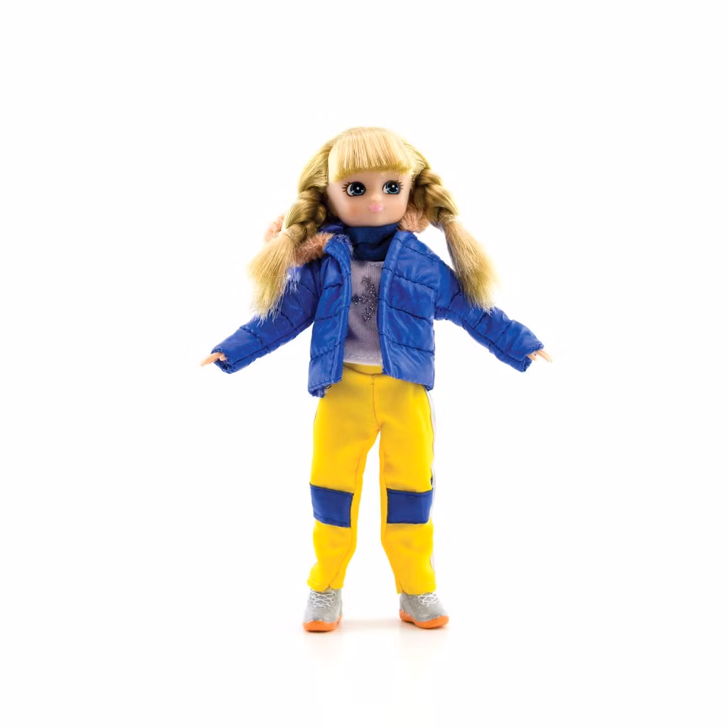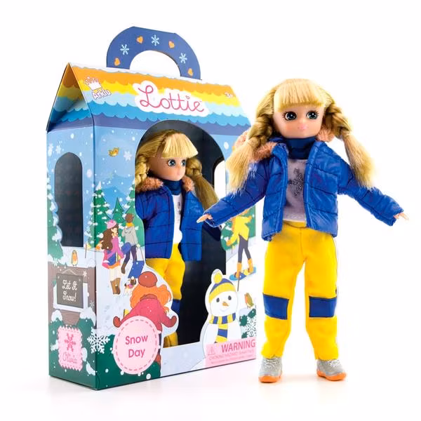 Lottie gillar vintern och fullkomligt älskar när det blir en perfekt snödag. Därför har hon nu fått vinterkläder som är perfekta för att kunna leka ute i snön - silvriga kängor, blå-gula termobyxor, en tjock blå jacka med luva, halsduk och en tjock tröja med en glittrig snöflinga på bröstet.