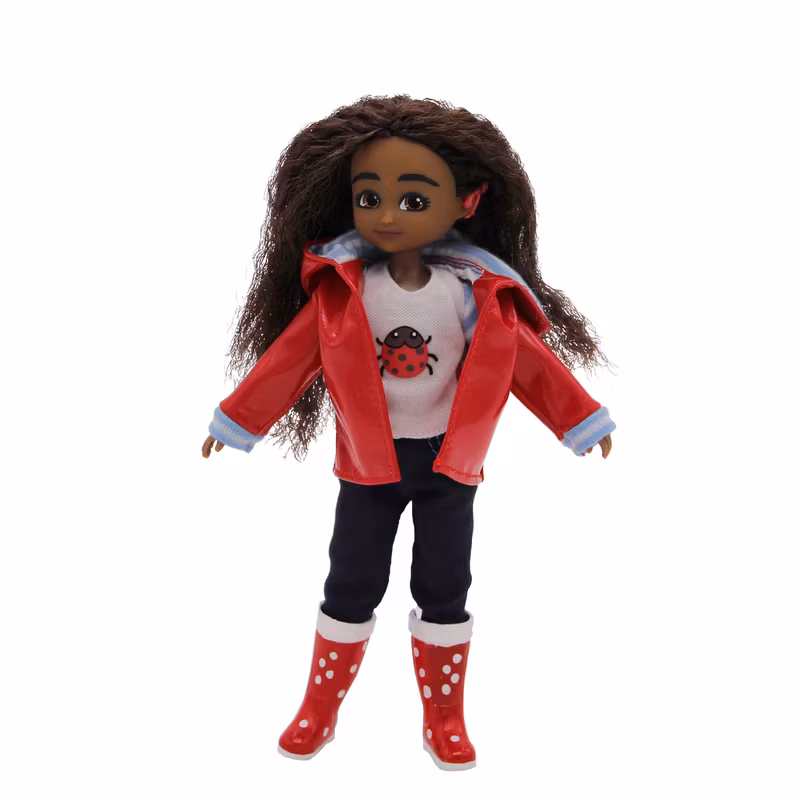 Den 18 cm höga dockan kommer med den utrustning hon behöver för en foto-utflykt i vildmarken: Röd regnjacka med huva, röda regnstövlar med vita detaljer, långärmad tröja med en nyckelpiga på, mörka jeans, kamera, skoltidning, axelväska, cochlear-implantat (se ovan) samt några bilder från vinnarna av Lotties Vilda djur foto-tävling.