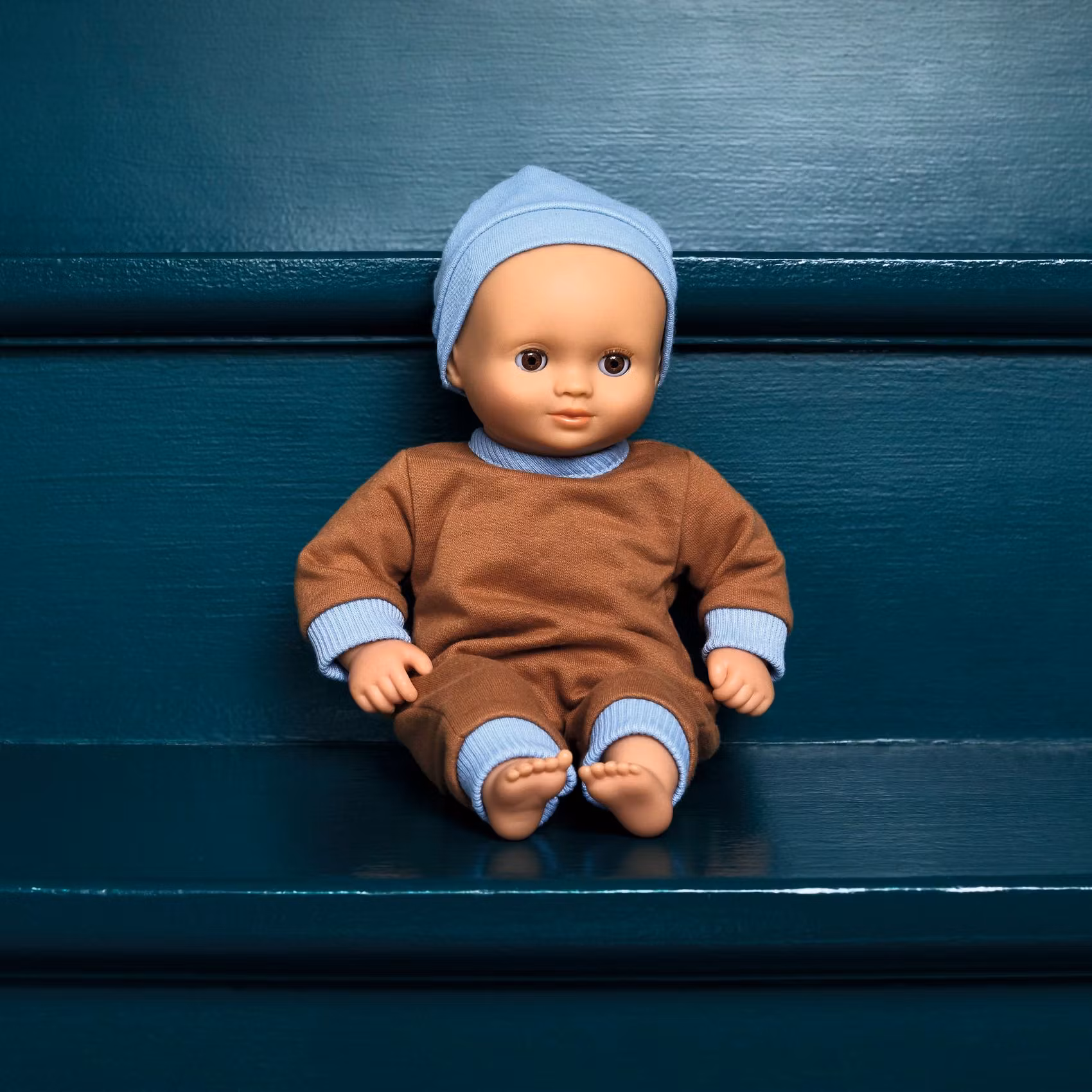 Med sina vackra bruna ögon och snygga kläder är baby Praline en söt docka med en storlek och lätt vikt som är perfekt anpassad för att passa i famnen hos små barn.