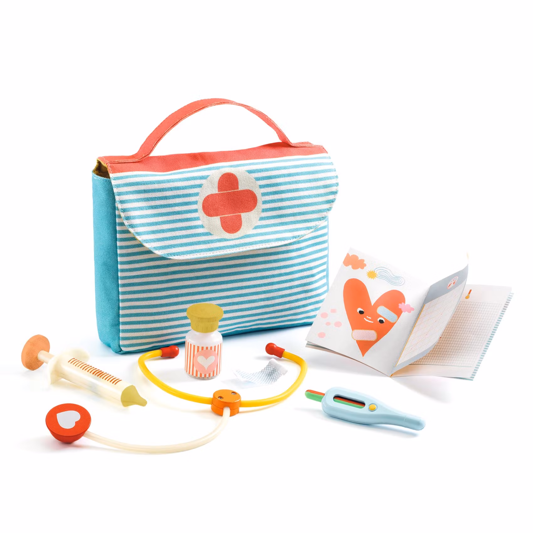 En snygg liten läkar-väska med alla tillbehör som behövs för att undersöka och sköta om en sjuk docka. Den snygga tygväskan innehåller: 1 termometer som visar rött om dockan har feber och grönt om temperaturen är okej, 1 stetoskop, 1 spruta för vaccinationer, 1 medicin burk, 1 plåster och ett häfte där dockans hälsa och utveckling kan skrivas ner i tabeller. Doktors-väskan har ett märke med två korslagda röda plåster och rymmer alla tillbehören så att de kan bäras med sig till de sjuka leksakerna.