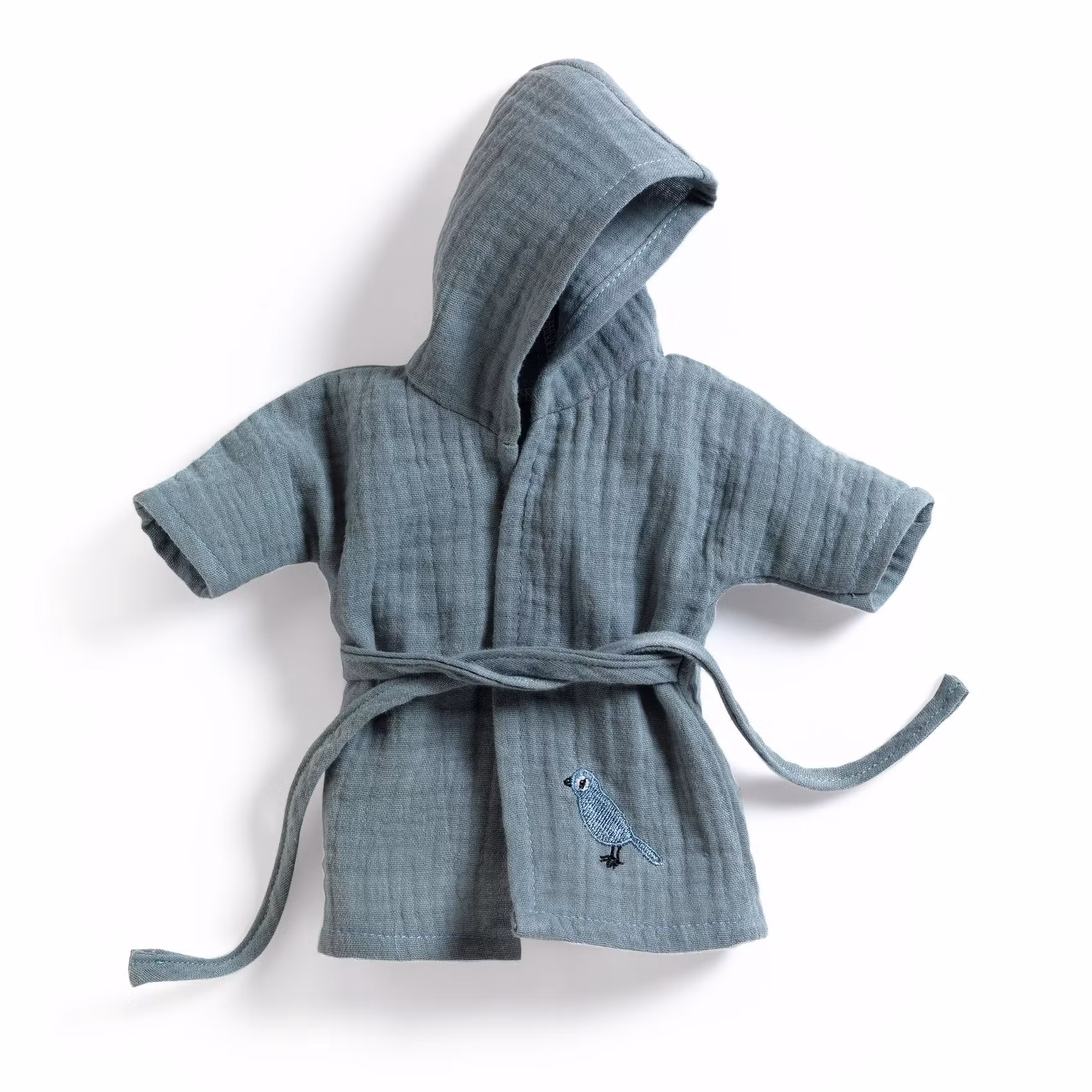 En söt blågrå badrock för dockan med en liten fågel broderad på ena sidan och är tillverkad av härligt luftig bomulls muslin - perfekt för att torka din bad-säkra docka efter ett skönt bad. Den söta badrocken har en luva, stängs med ett knytskärp och är tillverkad av ett tyg som torkar lätt.
