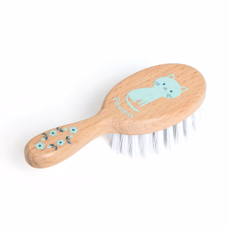 Hårborste gjord av björkträ och mjuk PET-plast-borst, som gör dock håret blankt och glänsande.