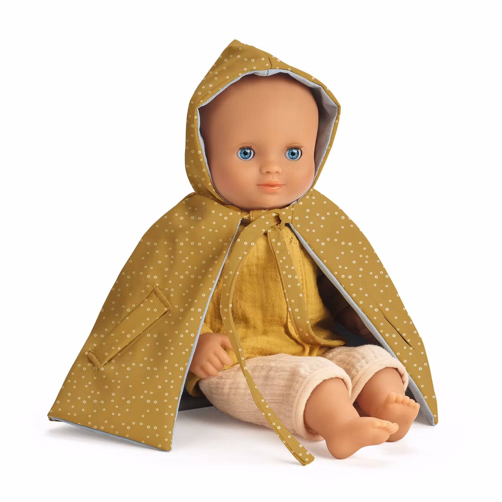 Det är vår och en regnskur är aldrig långt borta, så här är en snygg vaxad cape med huva, foder och ett mönster av små blommor som blir perfekt att skydda dockan från regnet med. Capen passar till dockor som är mellan 30 och 34 cm långa.