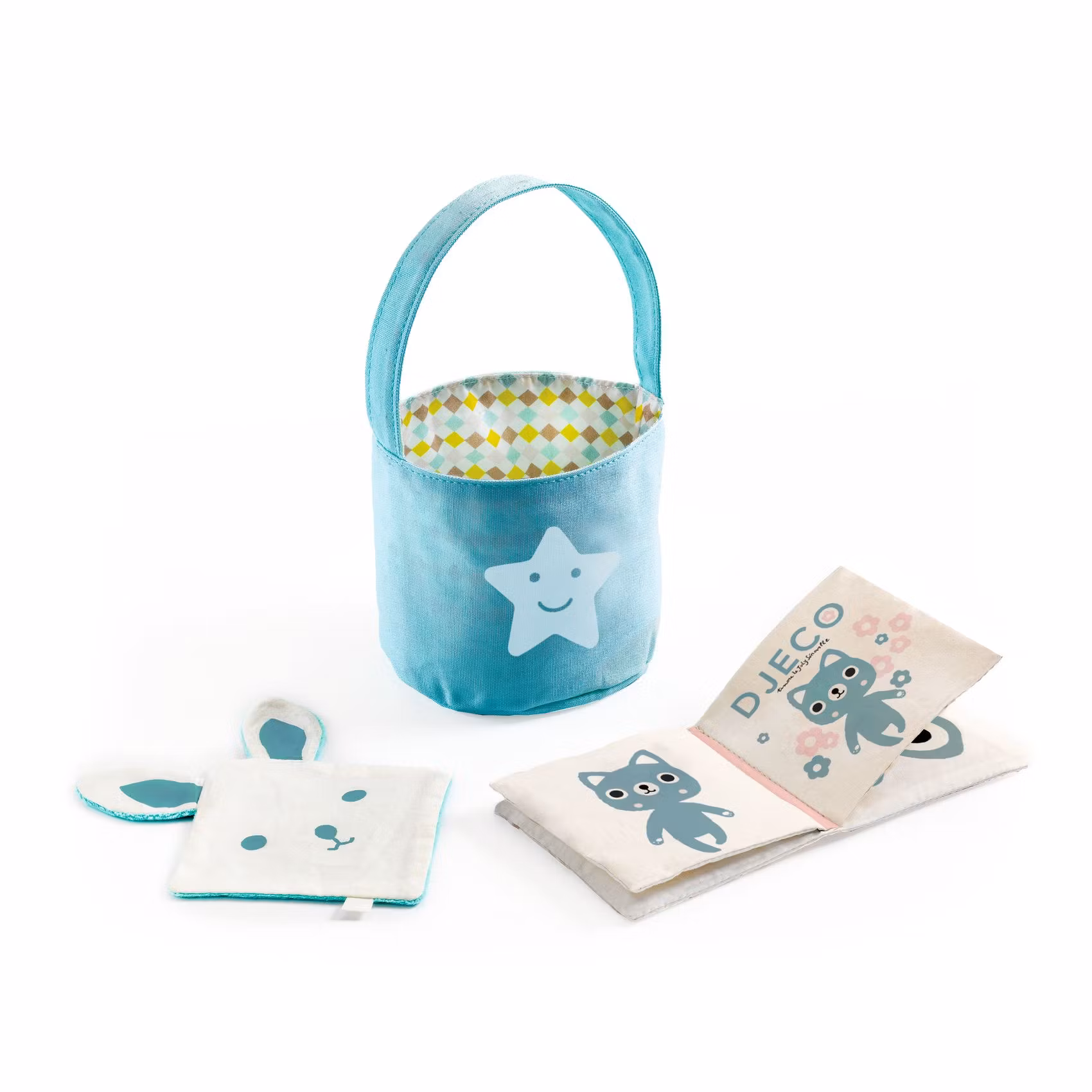 Den lilla runda korgen i bomull har ett handtag så att den kan hängas upp, en glad stjärna tryckt på framsidan och ett tryckt rutigt tyg med milda färger som foder.