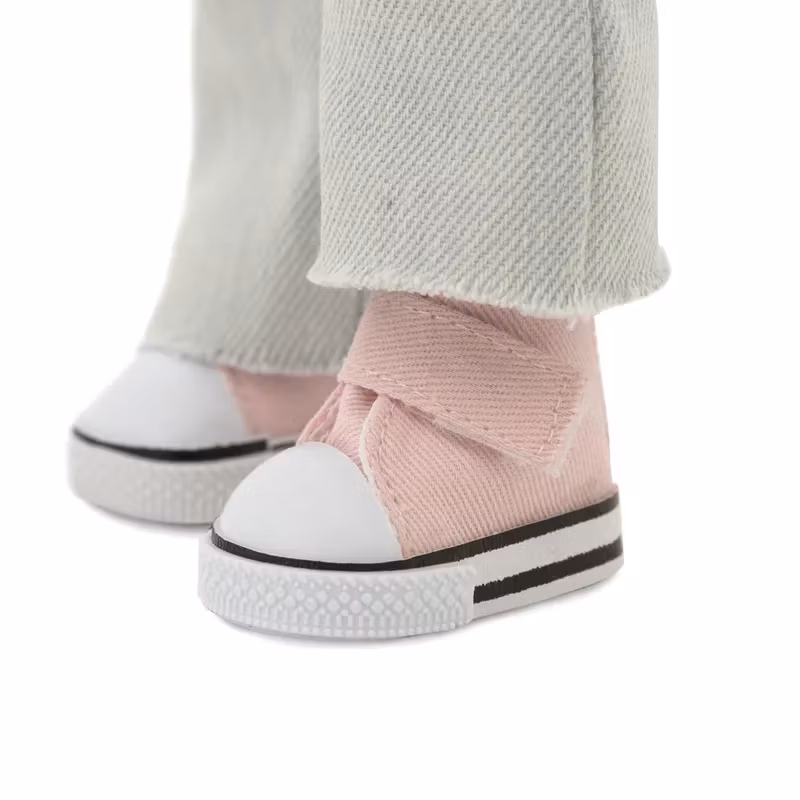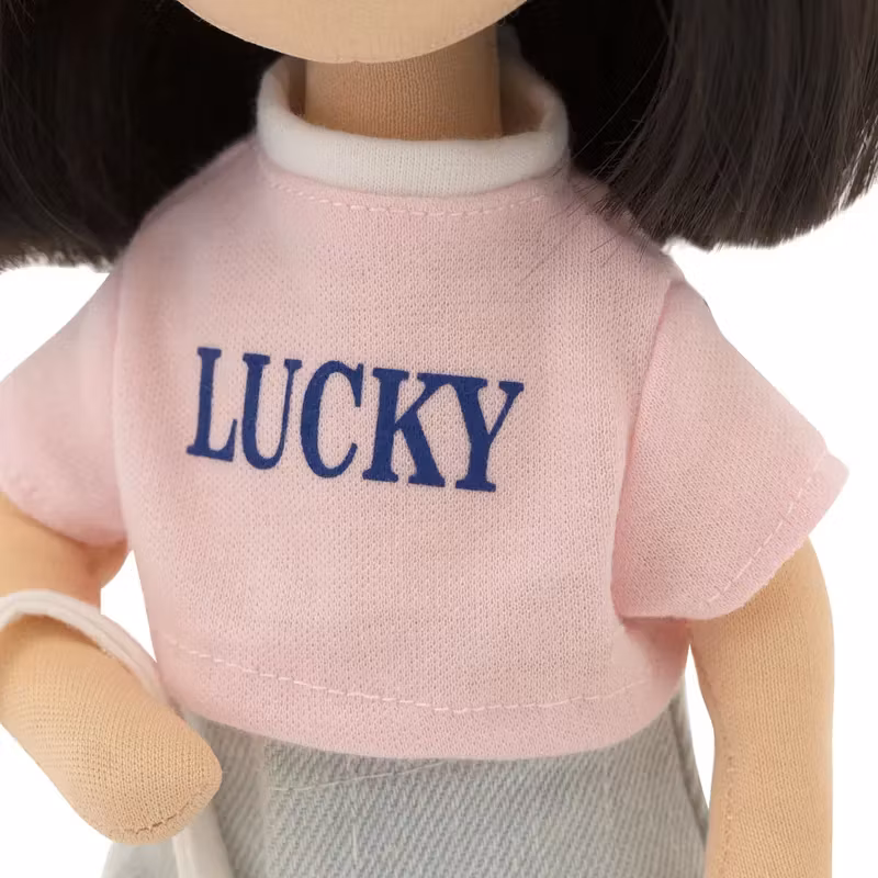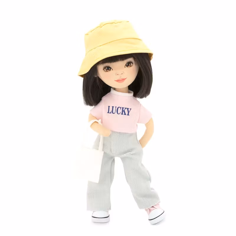 Dockan har dessutom en flexibel stomme i kroppen som gör att den kan stå upp och att du kan få den att posera nästan hur som helst. Hon är klädd i vida jeans, en kortärmad tröja med tryck, en gul solhatt samt rosa skor, och bär på en vit tygkasse.