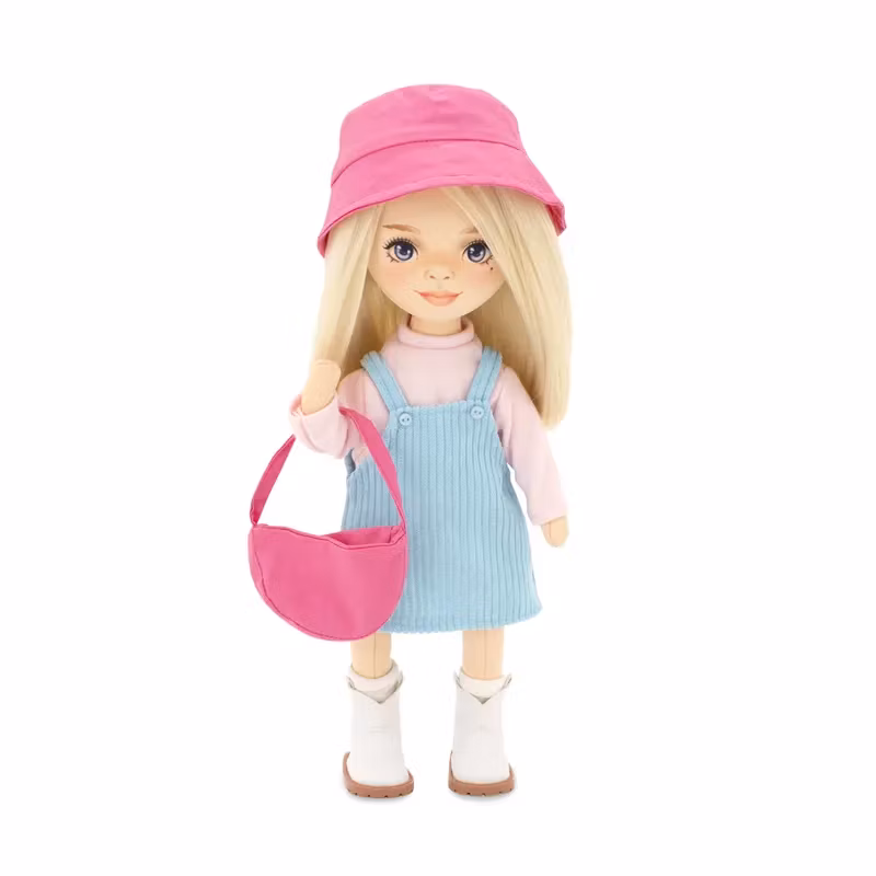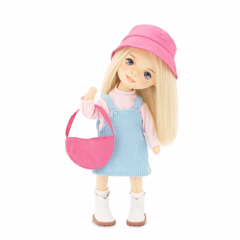 Hon är klädd i en söt blå hängsleklänning över en långärmad tröja, samt vita strumpor och korta stövlar, tillsammans med en snyggt formad rosa tygkasse eller handväska och en matchande solhatt.