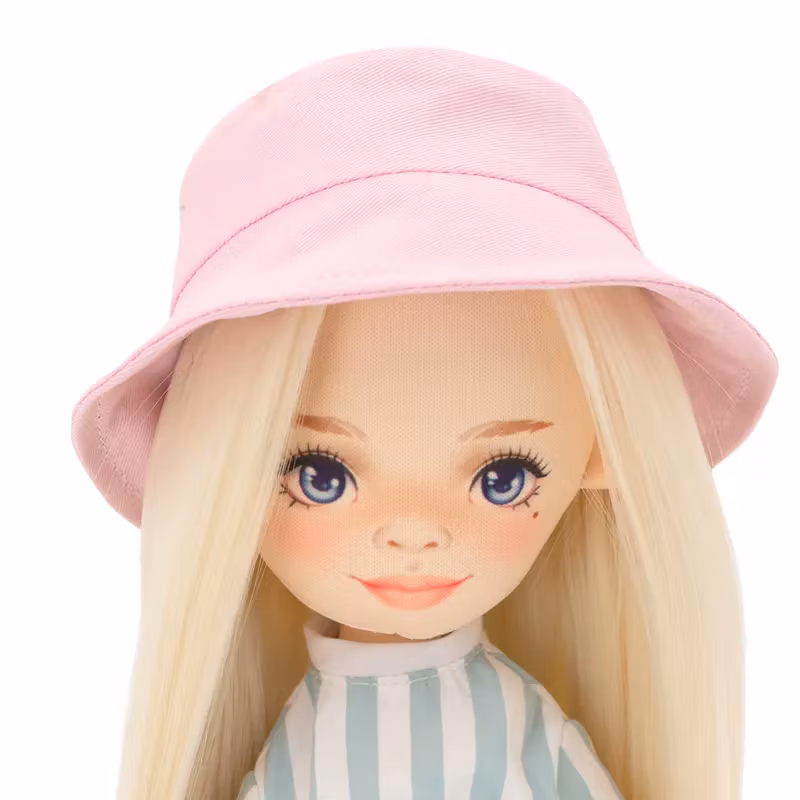 En elegant handgjord docka som har långt blont hår och vackra blågrå ögon som lyser upp ett ansikte fullt av karaktär.