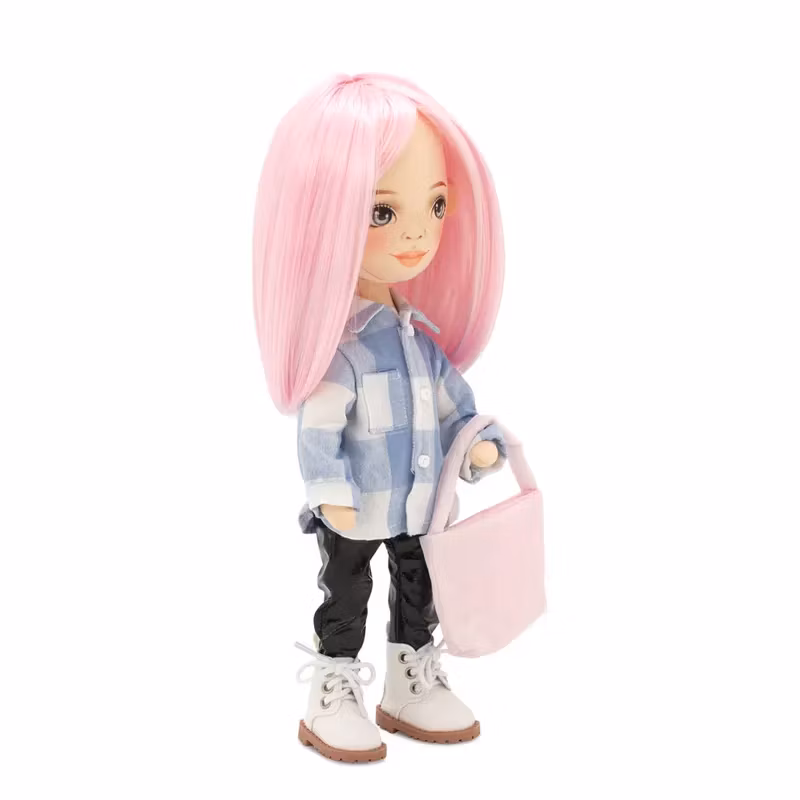 En elegant handgjord docka med axellångt rosa hår och vackra gråblå ögon i ett ansikte med karaktär. Det glänsande håret är av premium kvalitet och kan formas om med hjälp av till exempel locktång, så det är bara att leka stylist och experimentera med olika frisyrer och stilar!