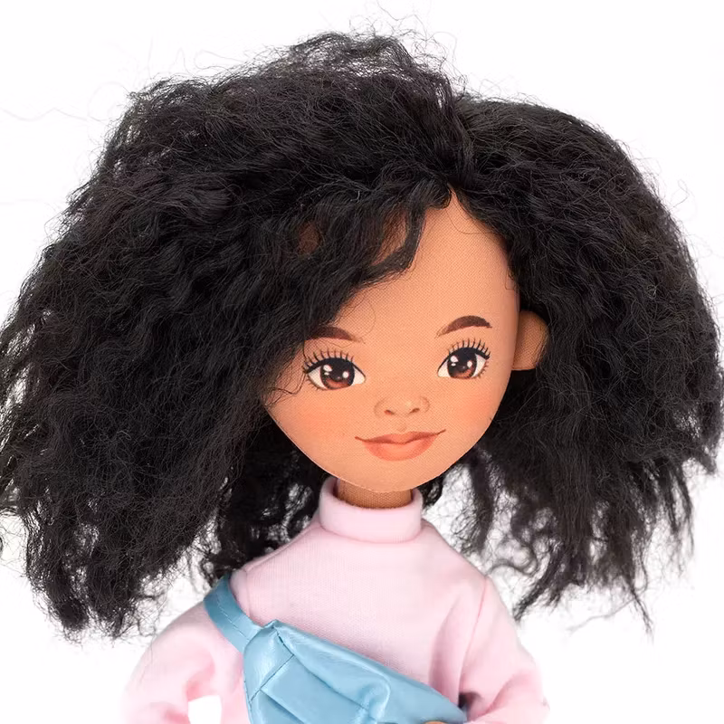 En elegant handgjord docka med mörk hy, långt svart afro hår och vackra bruna ögon som lyser upp ett ansikte fullt av karaktär.