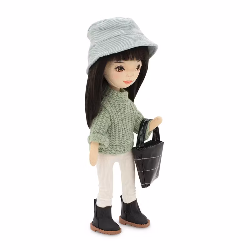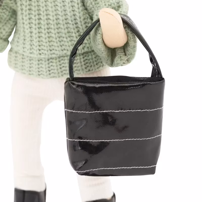 Hon är klädd i en snygg stickad tröja, vita ribbstickade leggings, en blekgrön solhatt i manchester och svarta stövletter, tillsammans med en glänsande svart handväska med dekorsömmar. Både kläderna och skorna går att ta av och passar alla dockor i serien.