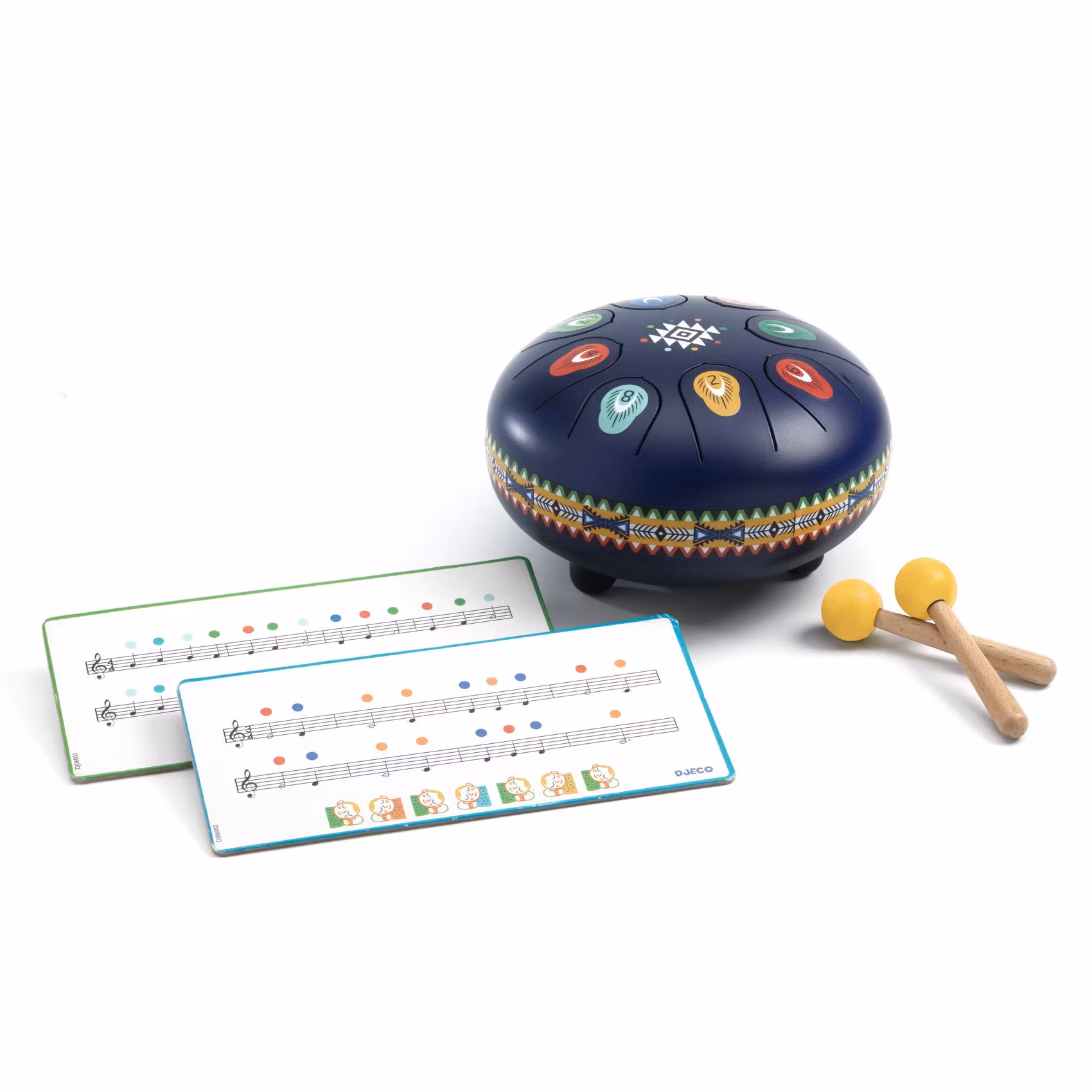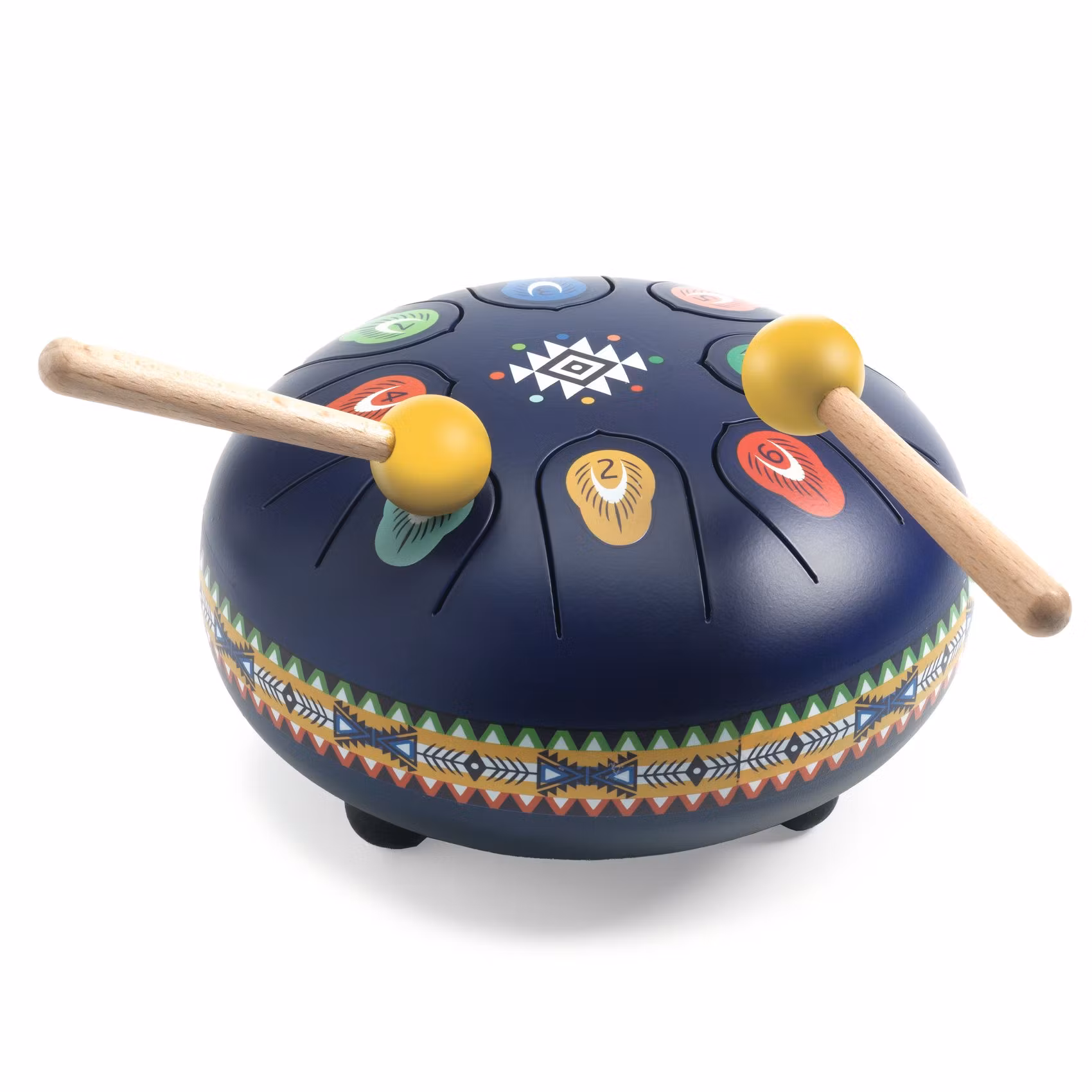 Detta slagverksinstrument har åtta tungor som var och en producerar en specifik ton. Att spela på trumman är både enkelt och intuitivt: det är bara att slå lätt på tungorna med trumstockarnas mjuka gummitoppar och njuta av de mjuka, avslappnande tonerna som sprider sig från instrumentet.