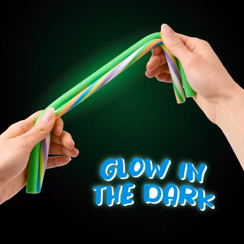 En cool display som innehåller 24 fantastiskt elastiska power band i glada neonfärger som dessutom kan lysa i mörkret. De fosforescerande banden laddas när de utsätts för ljus och glöder sedan i mörkret. De kommer i 6 olika färgvarianter: lila, gul, blå, grön, orange och flerfärgad. Dessa häftiga power band är perfekta för att bekämpa tristess - sträck ut, knyt knopar och mycket mer! Det finns ännu fler möjligheter om du har två band i olika färg. Varje band har en längd på ca 30 cm och kan sträckas ut till nästan 2 meter! Material: elastisk plast.
