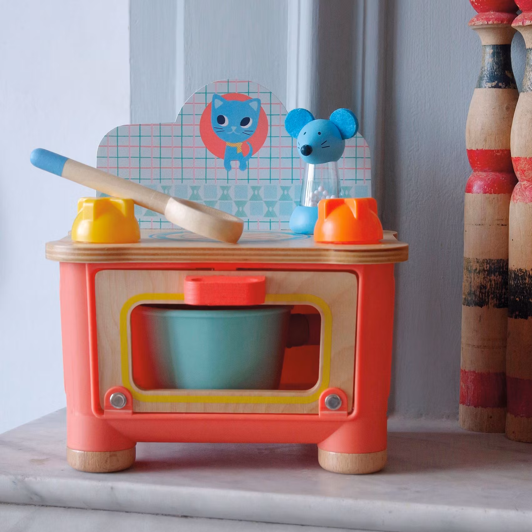 En lekfull och kompakt spis med ugn och spisplatta, speciellt designad för de yngsta barnen.