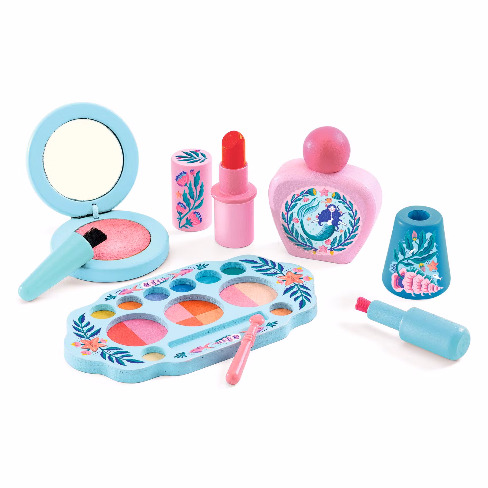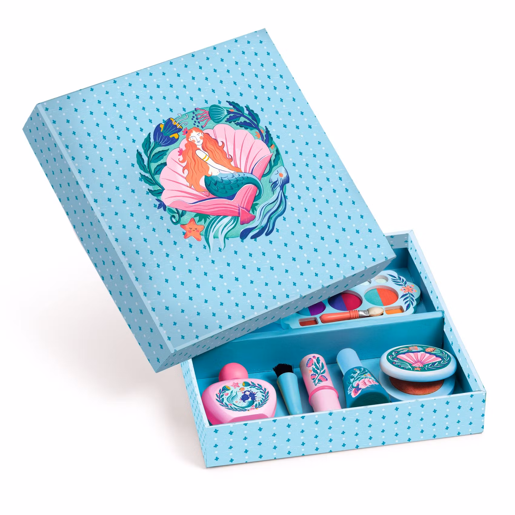 Ett fint set med smink i trä att leka vuxen med samt en söt ask, allting dekorerat med sjöjungfrur, snäckor och annat från havet. De realistiskt utformade delarna är tillverkade av FSC® certifierat trä och förvaras enkelt i den medföljande asken.
