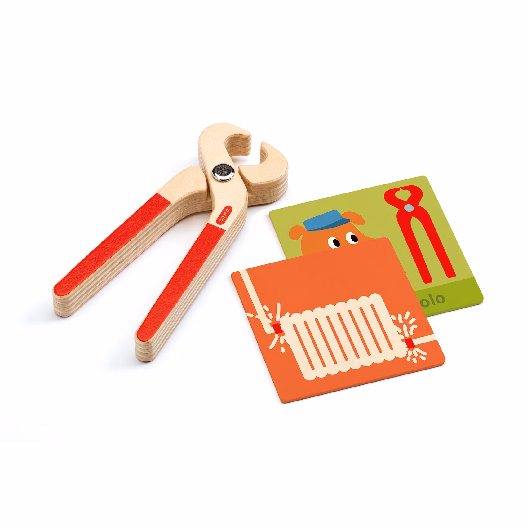 En häftig verktygslåda för små fixare med 5 verktyg i trä, 8 kort med ett uppdrag att fixa på ena sidan och rätt verktyg för jobbet på den andra. Verktygslådan är i trä och har plats för: hammare, såg, skruvmejsel, borrmaskin, tång, korten med saker att laga samt en mobiltelefon. Verktygslådan har en plats för varje verktyg så att den kan hållas i ordning. Detta set är en perfekt present till små fixare då det även utvecklar barnets finmotorik, fantasi och förståelse för verktyg och till vad de ska användas.
