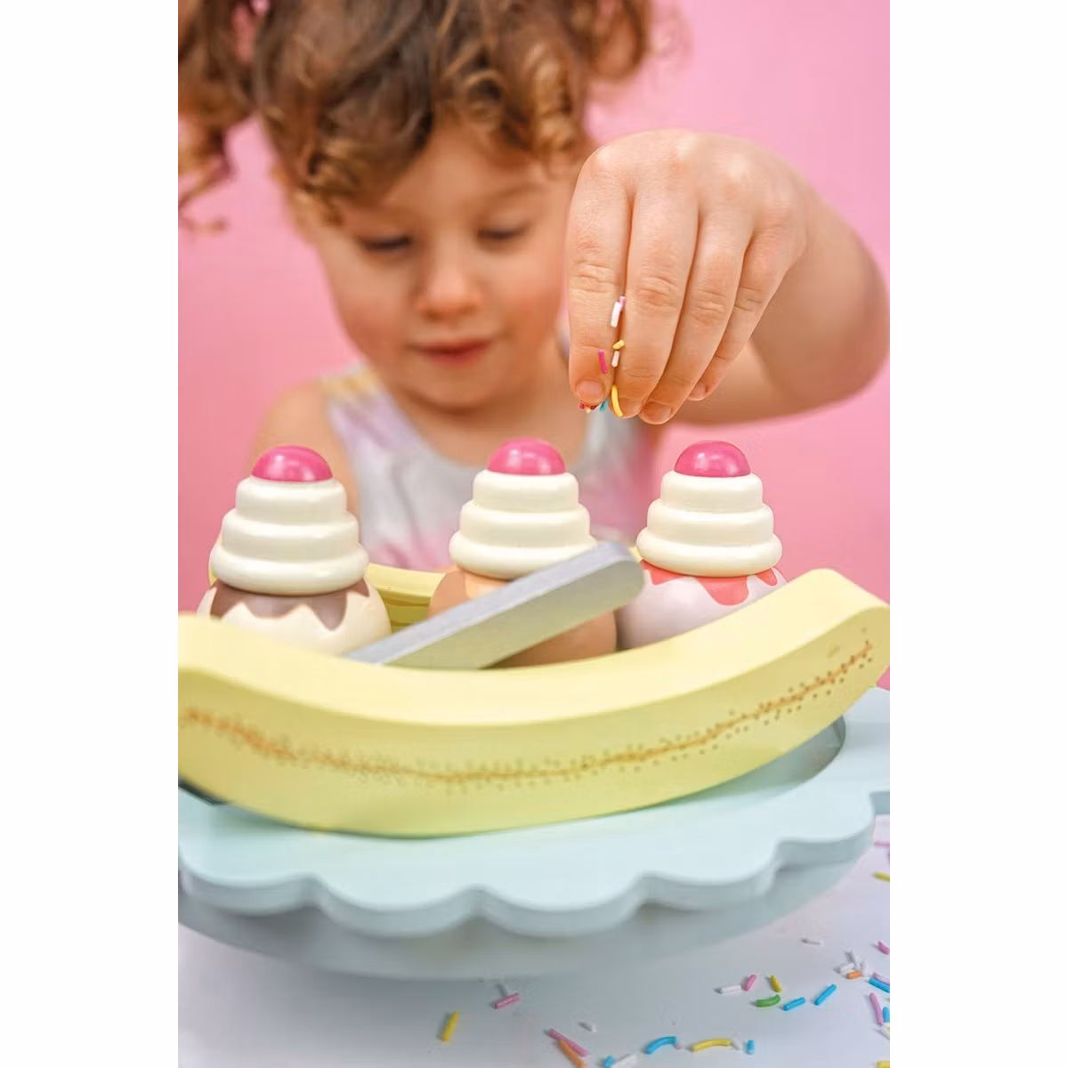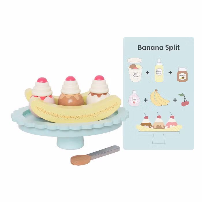 Ljuvlig banana split att bjuda sina vänner på. Nu kan du äntligen bygga och designa din alldeles egna banana split. Vad sägs om solmogna bananer, glass i olika härliga smaker och på toppen nyvispad grädde och körsbär. kan det bli bättre! Självklart ingår det även ett receptkort.