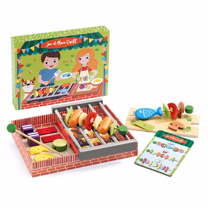 Använd t ex tomatbitar, ost, korv, fisk, rödlök, svamp med mera. Innehåll: 1 trälåda, 1 grillgaller, 1 skärbräda, 1 meny kort, 3 grillspett och 20 matvaror att grilla (av trä och filt).