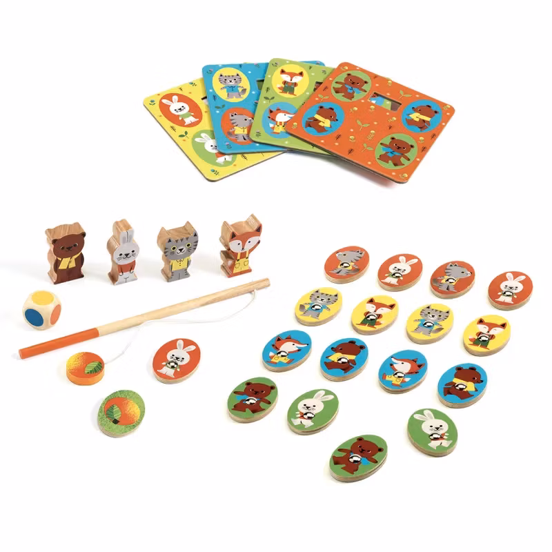 Spelet är designat runt fyra gulliga djur - en räv, en katt, en kanin och en björn. De olika delarna används till flera av spelen: brickorna som fiskas upp i fiskespelet är också de brickor som används i lotto-spelet och de brickor som vänds upp och ner för memory spelet (den upphöjda magneten på framsidan gör det enklare för små fingrar att plocka upp och vända på brickorna), spelpjäserna till brädspelet används för att visa vilka brickor du ska samla på i lotto-spelet och lådan som spelen kommer i vänds upp och ner för att bilda spelbrädet till brädspelet.