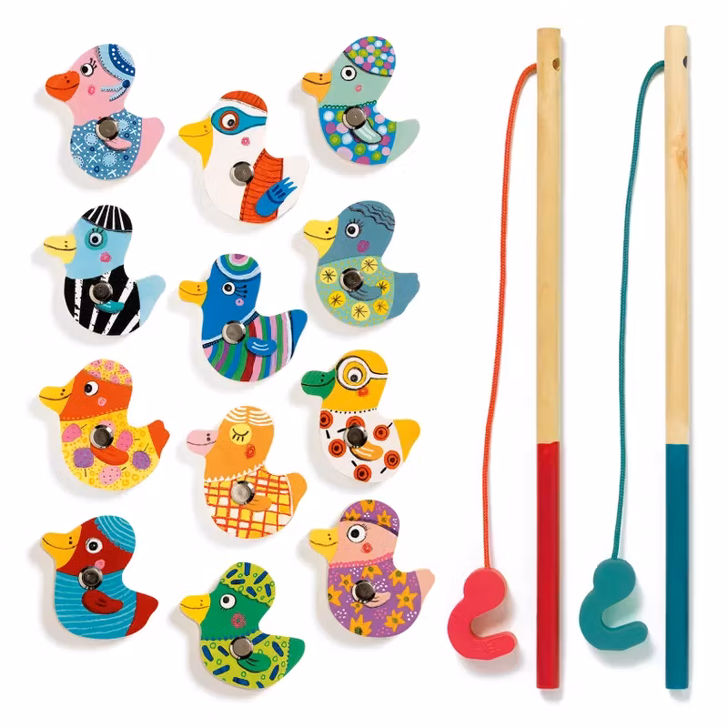 Detta set innehåller 12 färgglada ankor i trä med varsin liten metallbit som spelarna ska försöka träffa med kroken, två korta fiskespön med små magneter säkert infattade i fiskekrokarna av trä, samt en snyggt illustrerad förvaringsask som förvandlas till ankspelet från ett tivoli genom att ställa locket som bakgrund och försöka fiska upp ankorna ur lådan.