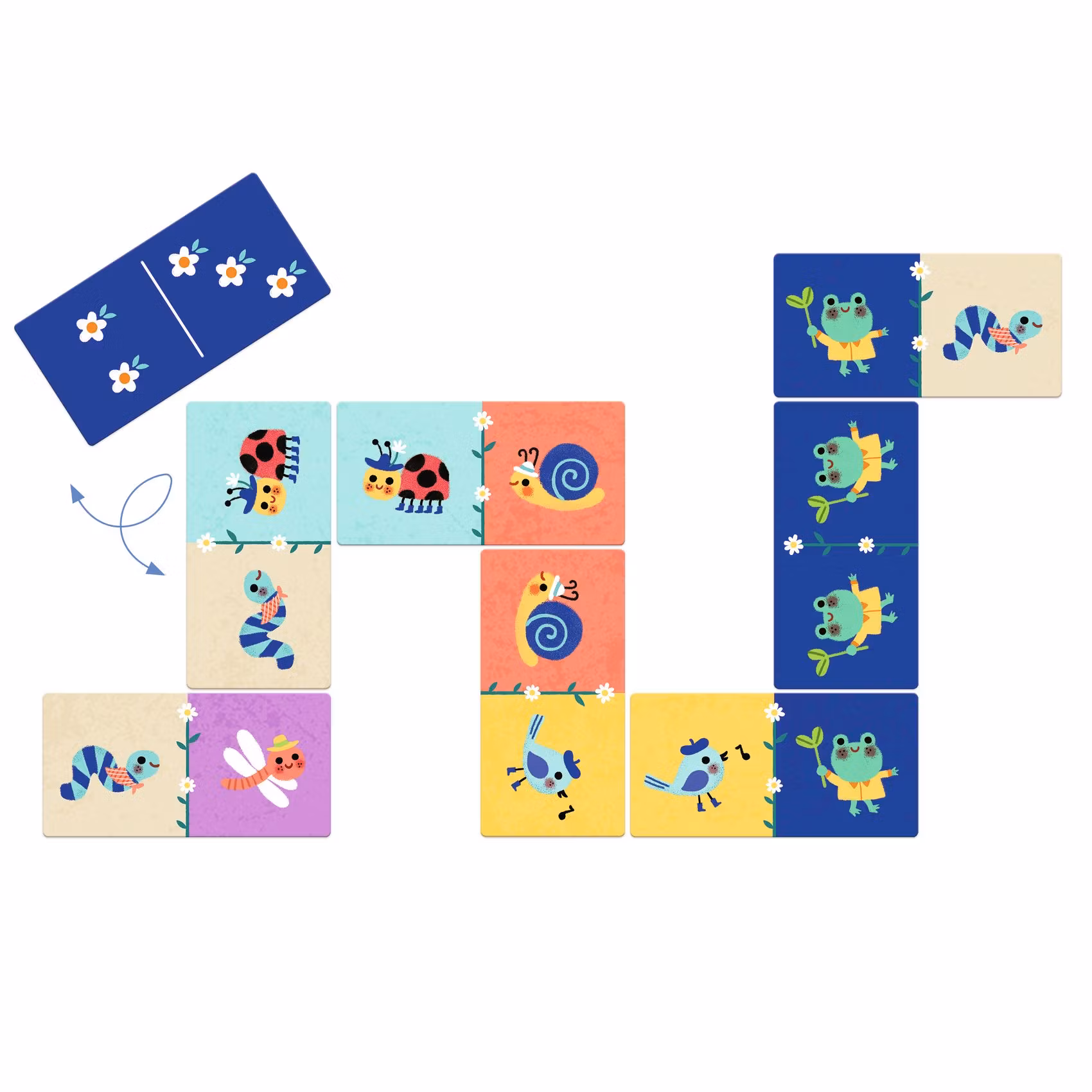 Ett domino spel för de yngre spelarna, där de ska matcha antingen siffror eller söta bilder av olika slags små djur. Spelarna kan välja vilken sida av de avlånga dominobrickorna som ska användas - sidan med djur eller sidan med siffror i form av ett antal små vita blommor. En domino bricka läggs ut på bordet och för att få lägga ner en av sina brickor ska en spelare i taget sedan försöka matcha bilderna eller siffrorna på sina brickor med de som finns i var ände av den rad eller orm av brickor som snart bildas. Den förste spelare som lyckats placera ut alla sina brickor vinner spelet. Ett kul sätt att öva på sin observationsförmåga och enkel taktik. Spelet kommer i en kub-formad låda med ett handtag av snöre som gör den enkel att ta med sig. Delarna är tillverkade av tjock, FSC® certifierad kartong och lätta att hantera även för små fingrar. Innehåll: 28 dominobrickor (6,5 x 13 cm), 1 förvaringsbox.