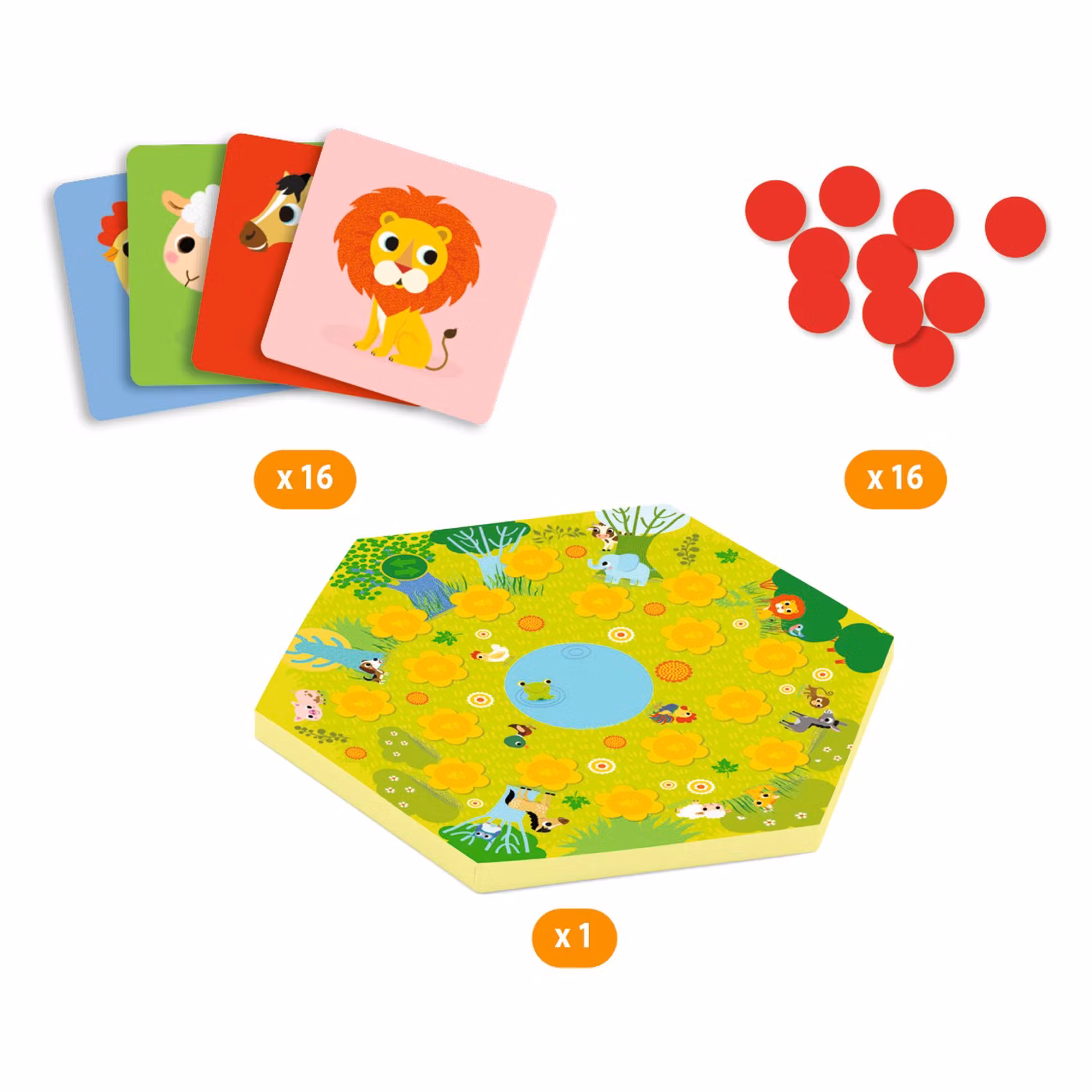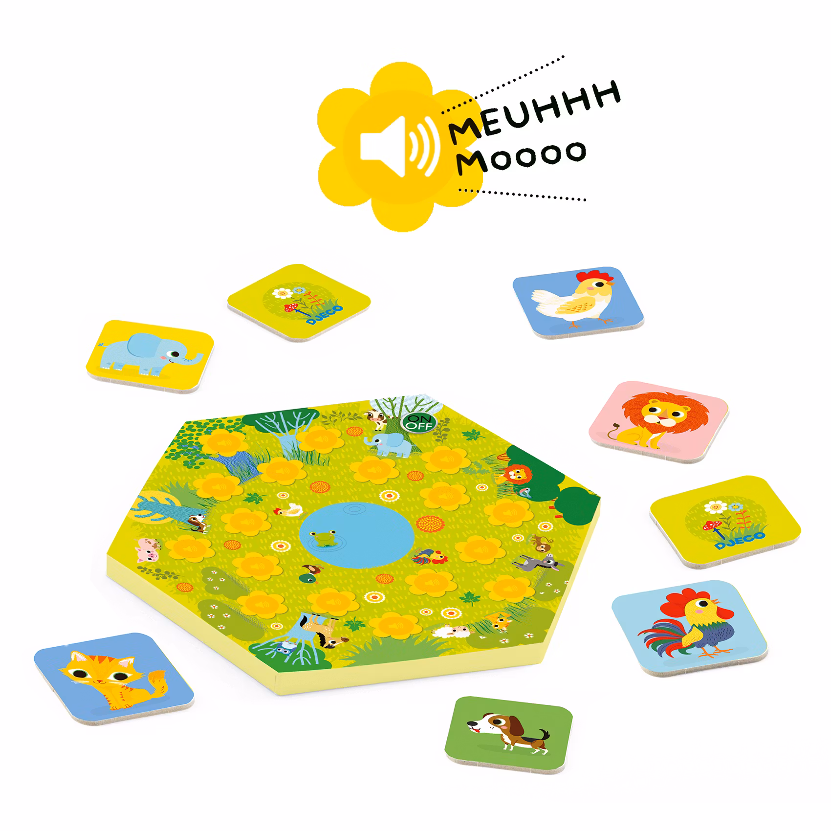 Ett kul spel med djurläten där det gäller att vända på ett av de utspridda korten och sedan gissa eller lista ut vilken knapp du ska trycka på för att få höra ljudet från djuret på kortet du vände. Om ljudet stämmer överens med djuret på kortet vinner du kortet och det gäller att ha vunnit flest kort när spelet är slut. Ett kombinerat memoryspel.