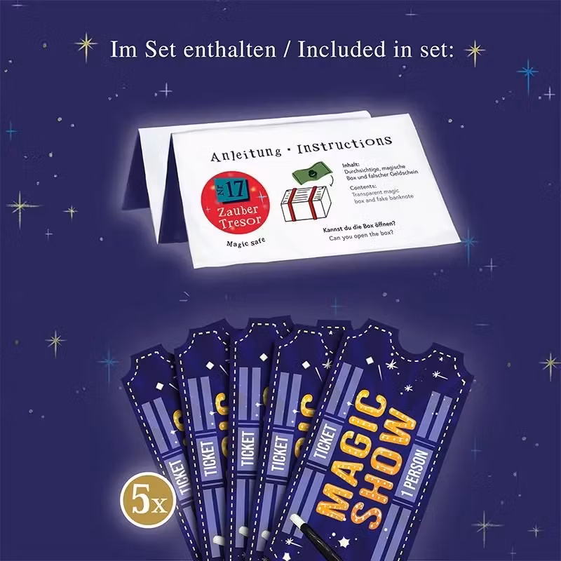 Innehåll: 1 genomskinlig magisk låda, 1 (leksaks-) sedel, 5 biljetter till din magiska show, instruktioner (på tyska och engelska), samt en förvaringsask med en QR-kod som leder dig till Youtube-videon (på tyska).
