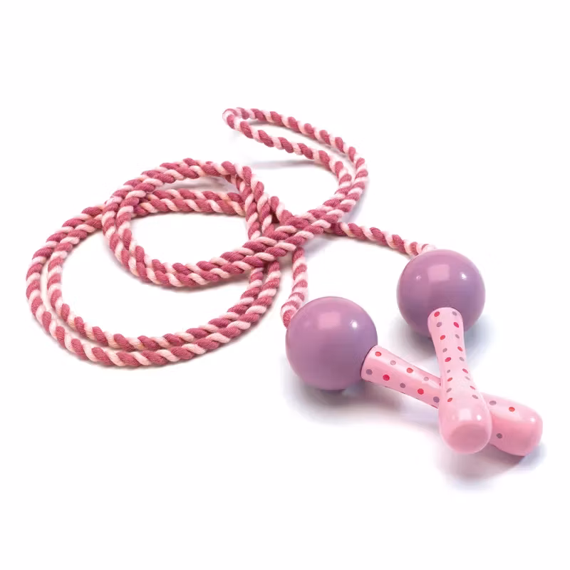 Ett fint och färgglatt hopprep med trähandtag och rep av bomull.
