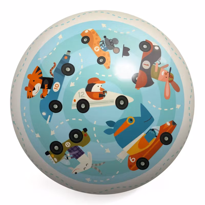 En härlig boll i plast med ett underbart motiv av djur som är ute och kör bil.