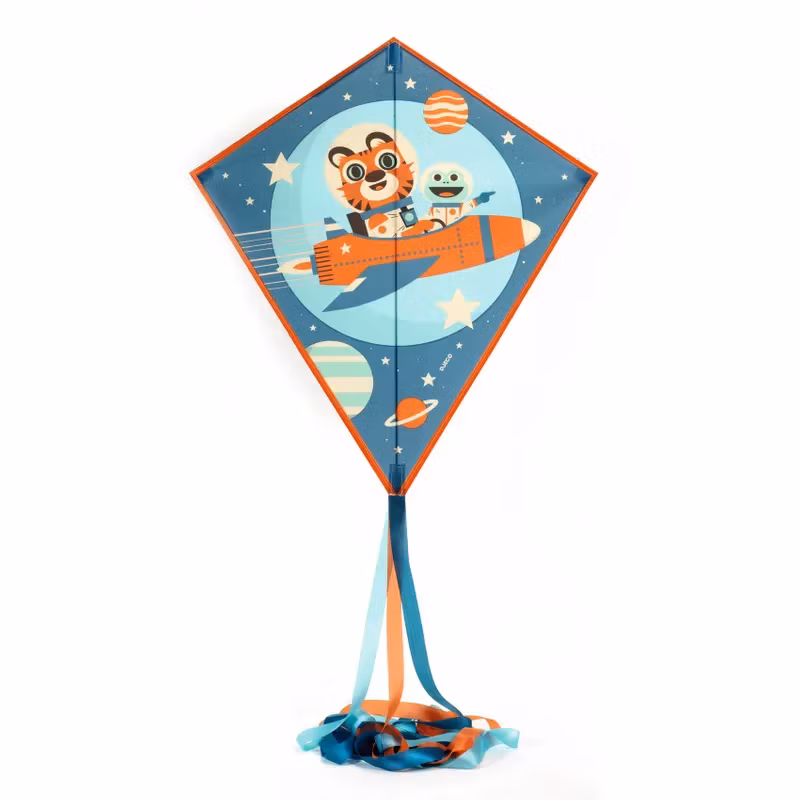 Denna tuffa och färgglada drake med klassisk form är illustrerad med en rymdraket som susar omkring i rymden med två djur ombord och har en 2,5 meter lång svans av tre band som hjälper draken att fånga vinden.