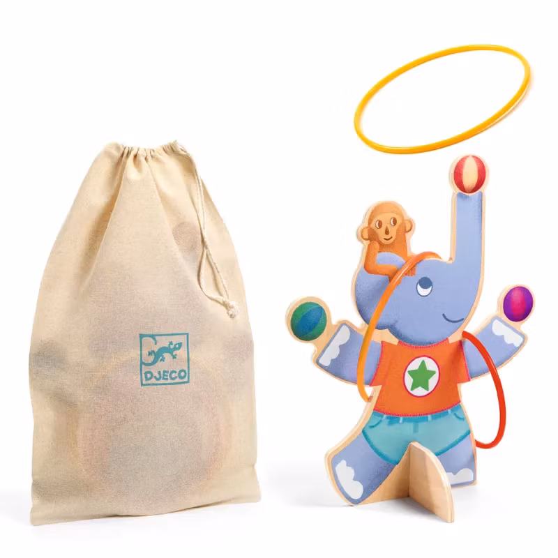 Oola Hoop är ett tidlöst spel där varje spelare kastar tre ringar i olika storlekar mot ett roligt utformat mål, i form av en elefant, och får mer poäng ju mindre ringen är som hängt sig runt någon del av målet.
