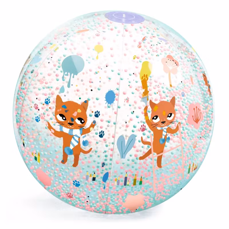 En lätt och snygg uppblåsbar badboll med vackra illustrationer av söta katter, färgklickar och blommor på genomskinlig bakgrund.