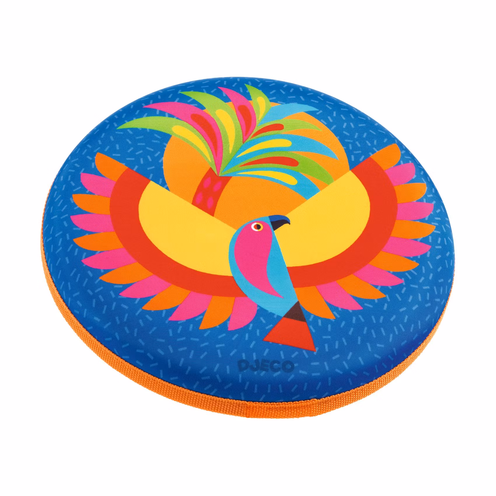 Från +4 till ca 8 år. En härlig liten frisbee med ett färgglatt motiv som föreställer en tropisk fågel. En kul och extra barnvänlig typ av frisbee i ett lätt och flexibelt foam material som också är vattentåligt. Frisbeen är kantad med textil för bättre hållbarhet och den lätta vikten samt det mjuka materialet gör det kul och säkert att leka med den för barn i alla åldrar. Många härliga timmar rolig lek väntar! Storlek: Ø 20 cm, vikt 36,5 g.