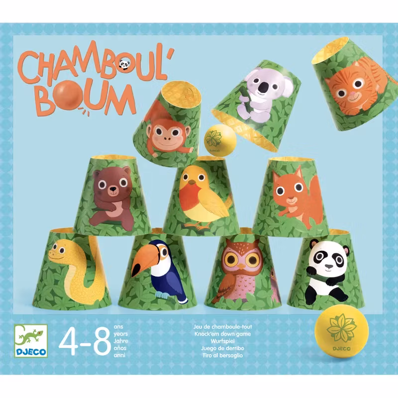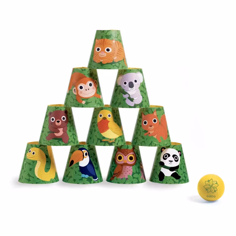 Ett roligt och klassiskt spel eller tidsfördriv där ni ska slå ner de 10 staplade djuren med en liten mjuk boll.