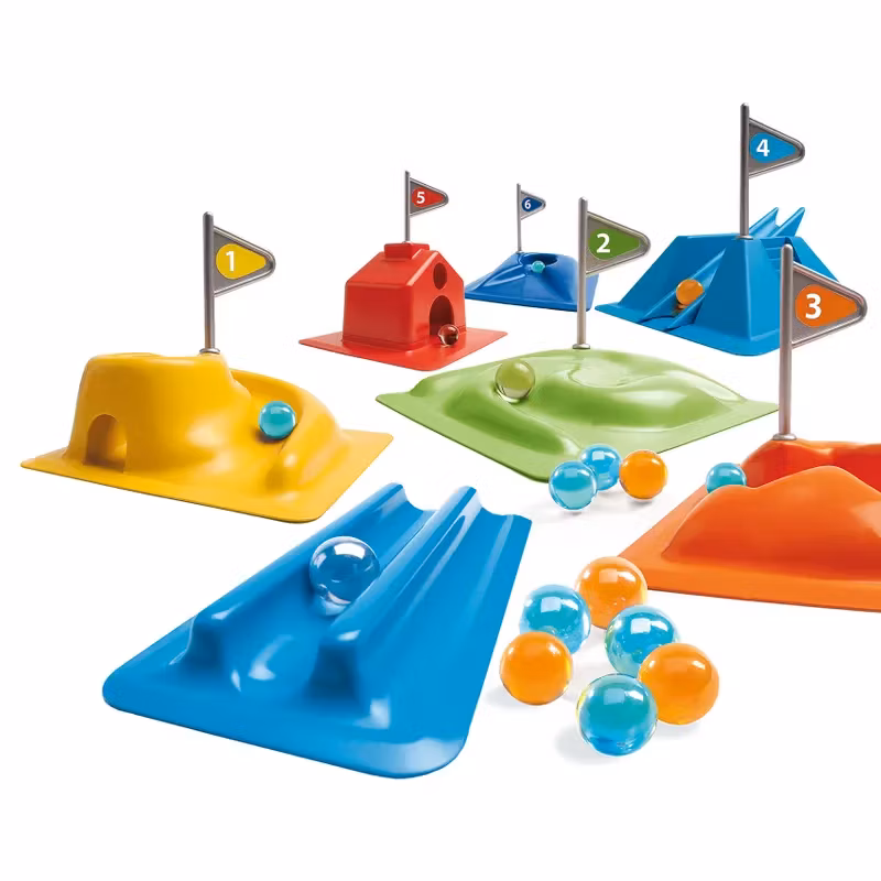 En riktigt rolig och färgglad minigolfbana för kulor med 6 olika banor där du får olika utmaningar.