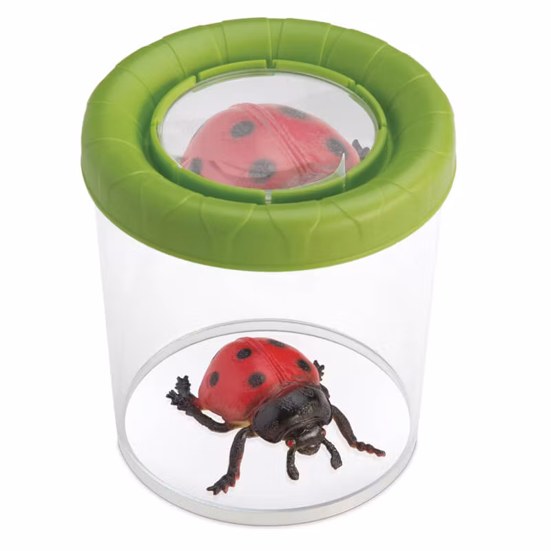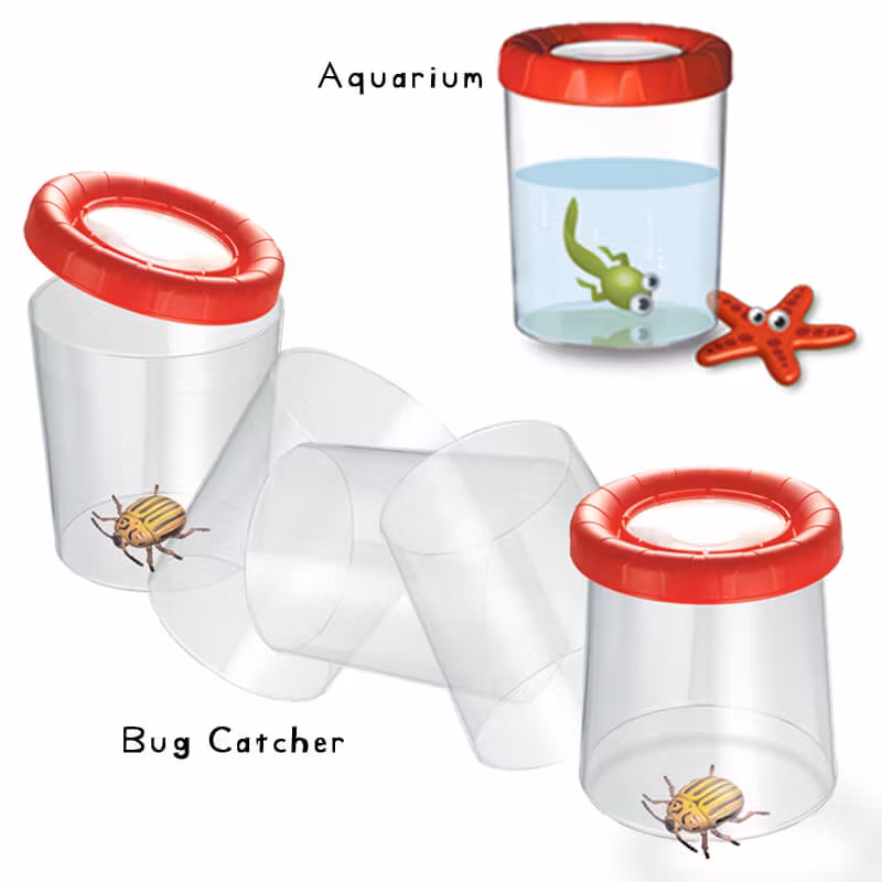 En stor insektsburk med förstoringsglas för att observera insekter, små vattenlevande djur, grodyngel med mera. Den är VÄNDBAR och förstoringslinsen kan sättas i båda ändar, vilket ger dubbla funktioner: stängd för att observera små varelser som stoppats i burken, eller med botten upp och öppningen ner för att fånga och observera direkt på plats, t ex mot en trädstam.