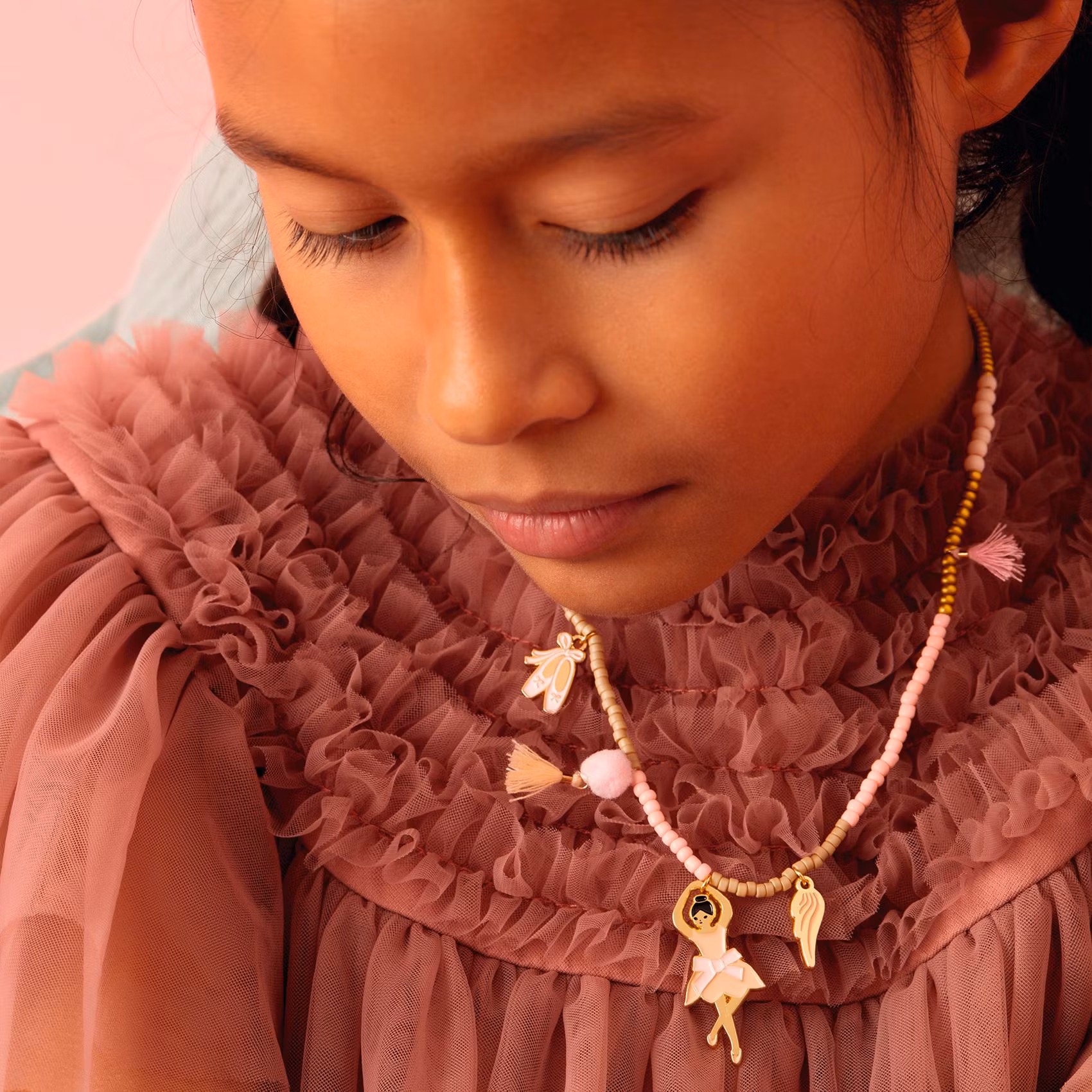 Ta ett steg in i den eleganta världen av dans och balett med det graciösa och eleganta halsbandet Isadora. Halsbandet består av akrylpärlor och pryds av tre emaljerade hängen i rostfritt stål - en ballerina, ett par balettskor och en vinge - samt tre mjuka tofsar av bomull.