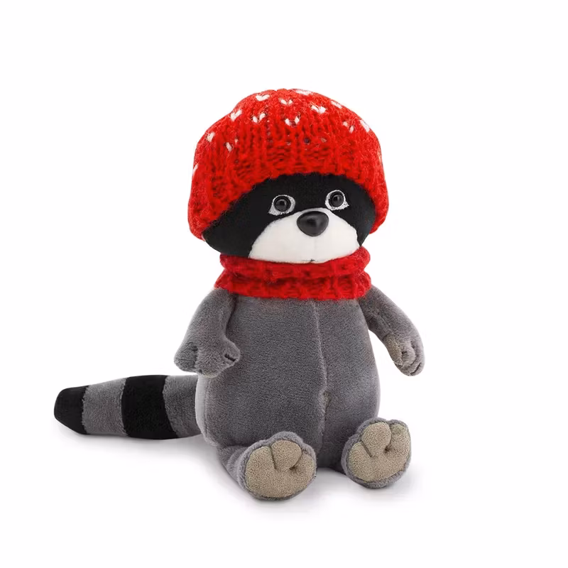 Denna gosiga tvättbjörn har klätt sig för kyligare väder i ett förtjusande stickat set med tranbärsröd polokrage och en matchande mössa med ett diskret mönster av vita maskor.