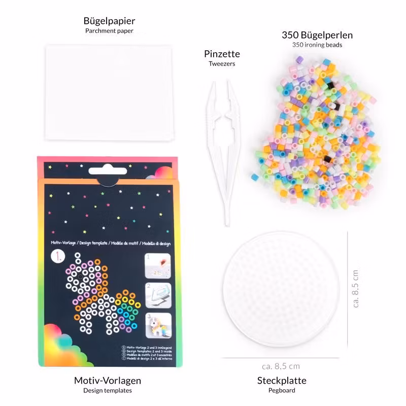 Innehåll: 3 motivmallar (regnbåge, enhörning, enhörningshuvud), pegboard (Ø ca 8,7 cm), ca. 340 pärlor, pincett, strykpapper.