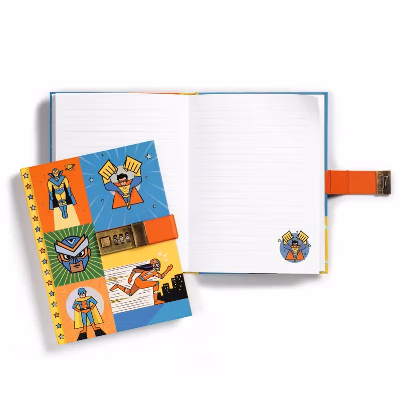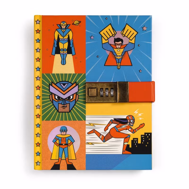 En tuff dagbok eller skyddad anteckningsbok med superhjältar som tema, där du kan skriva och rita ner alla dina hemligheter.