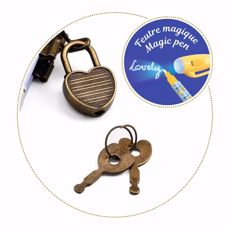 Innehåll: 1 dagbok (13,5 x 10 x 1 cm, 88 linjerade sidor på 120 g/m2 papper) med hårda pärmar, 1 hänglås med 2 nycklar, 1 magisk denna med osynligt bläck och kork med UV-lampa i korken (inklusive 3x LR44 HD knappcellsbatterier).