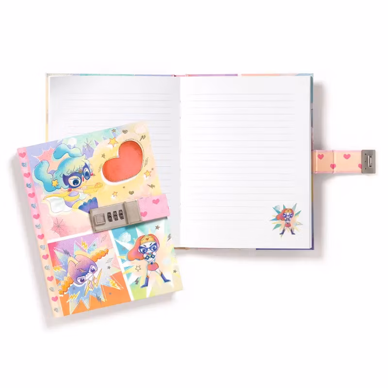En snygg och tuff dagbok eller skyddad anteckningsbok med kvinnliga superhjältar som tema, där du kan skriva och rita ner alla dina hemligheter.