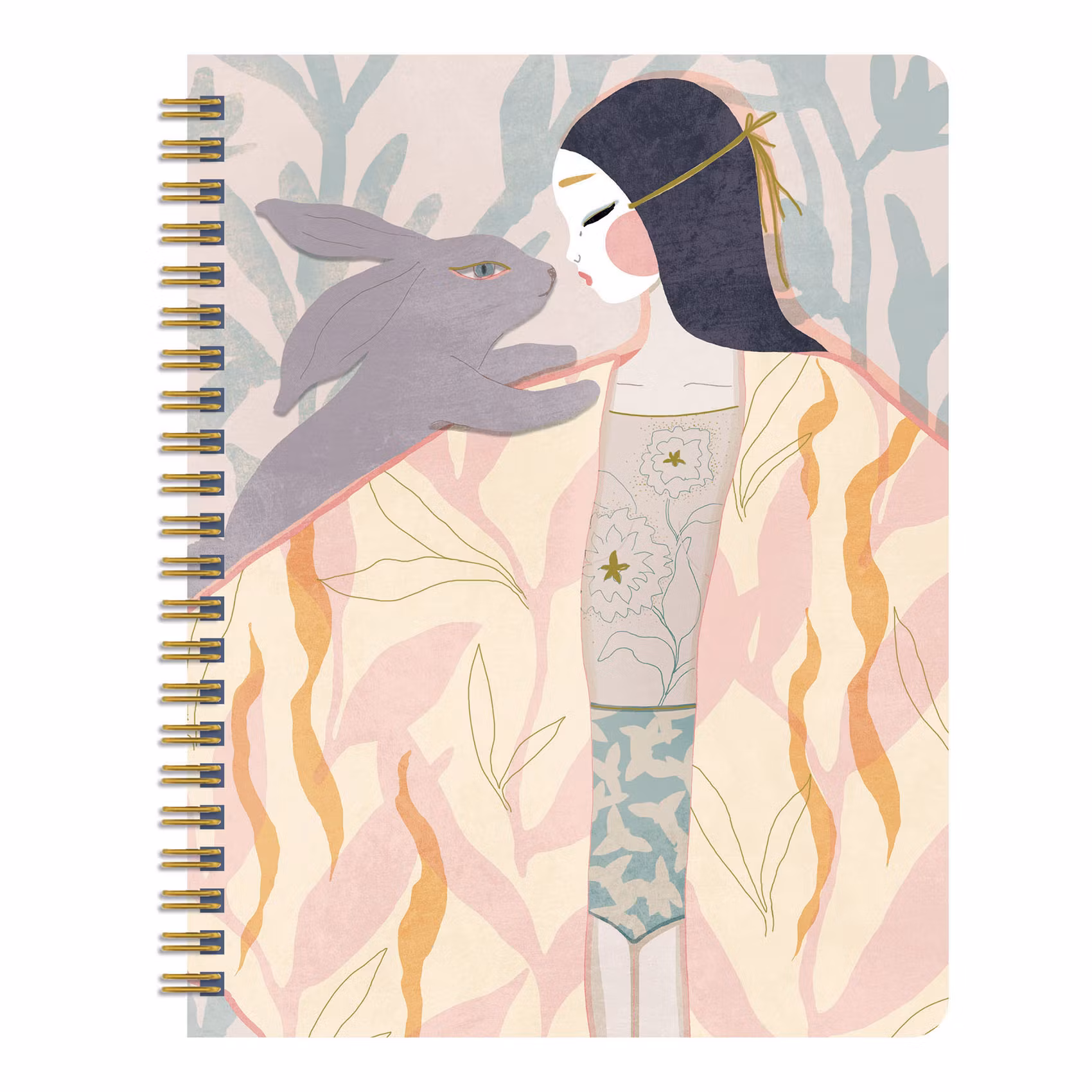 Ett riktigt vackert anteckningsblock med hård pärm dekorerad med en vacker bild på en geisha-inspirerad kvinna tillsammans med en kanin, och dekorerad med metallglänsande detaljer. Anteckningsblocket innehåller 88 sidor av 120 g linjerat och FSC®️ MIX certifierat papper med en liten bild på varje sida, ihopbundna med dubbel spiral.