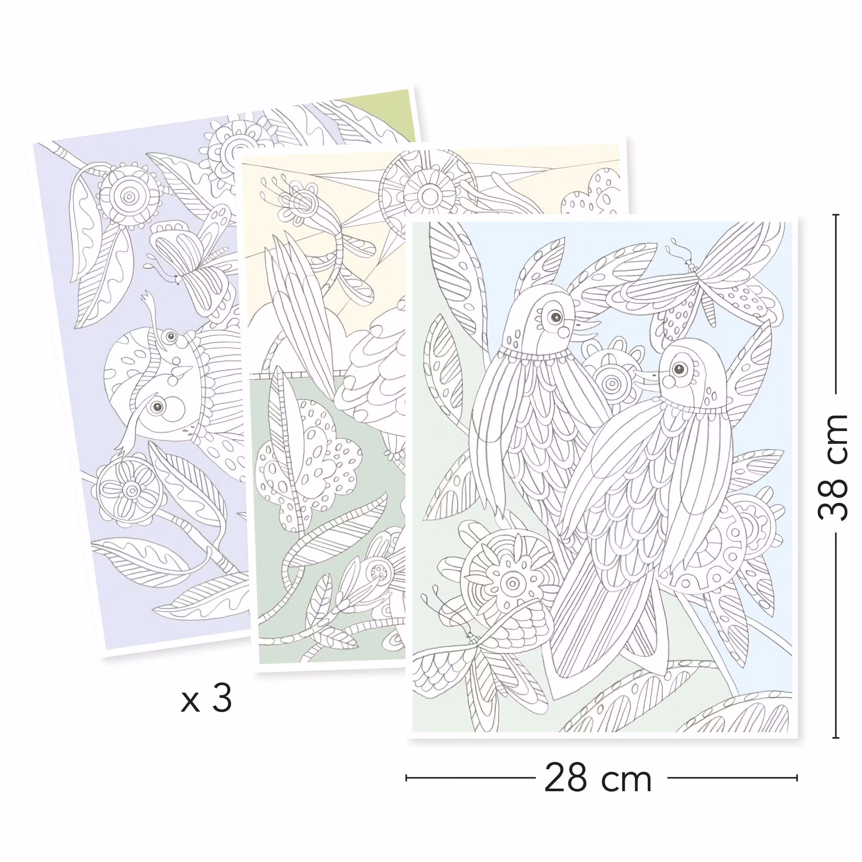 Djeco- Colouring Gallery - Birds / Målar alt klisterbok. Pyssla.