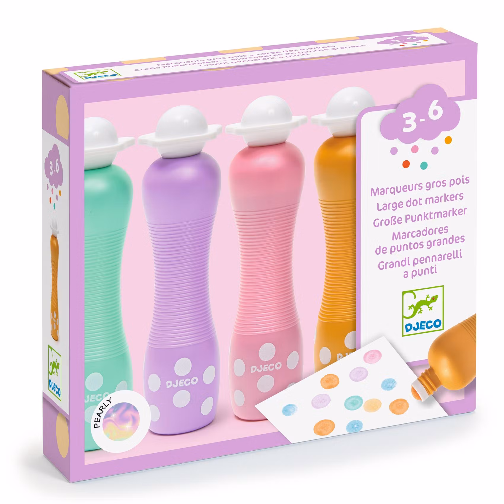 Från +3 till ca 6 år. Tjocka tuschpennor som har tusch med en härlig pärlemoreffekt och trubbiga skumspetsar som skapar prickar när de trycks mot pappret.